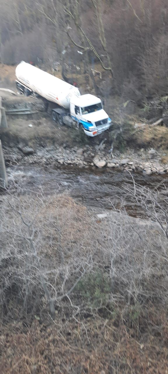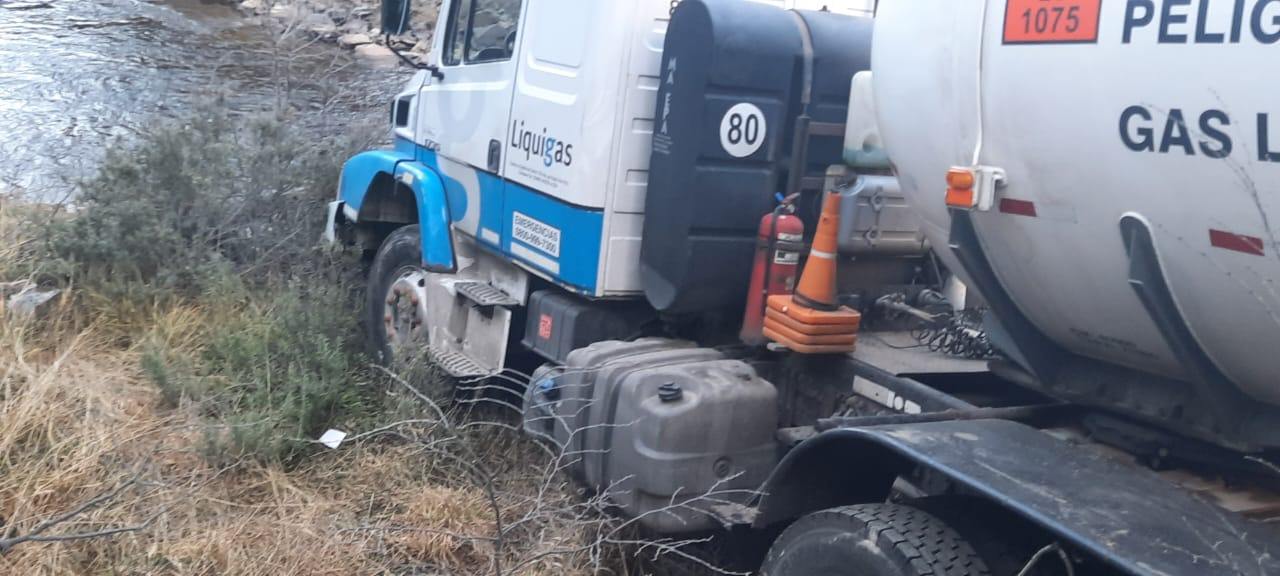 En horas de la madrugada, en el kilómetro 3045 de la Ruta Nacional N° 3, se produjo el despiste de un camión semirremolque que transportaba gas, el cual quedó desbarrancado en el lateral del puente sobre el Río Olivia.