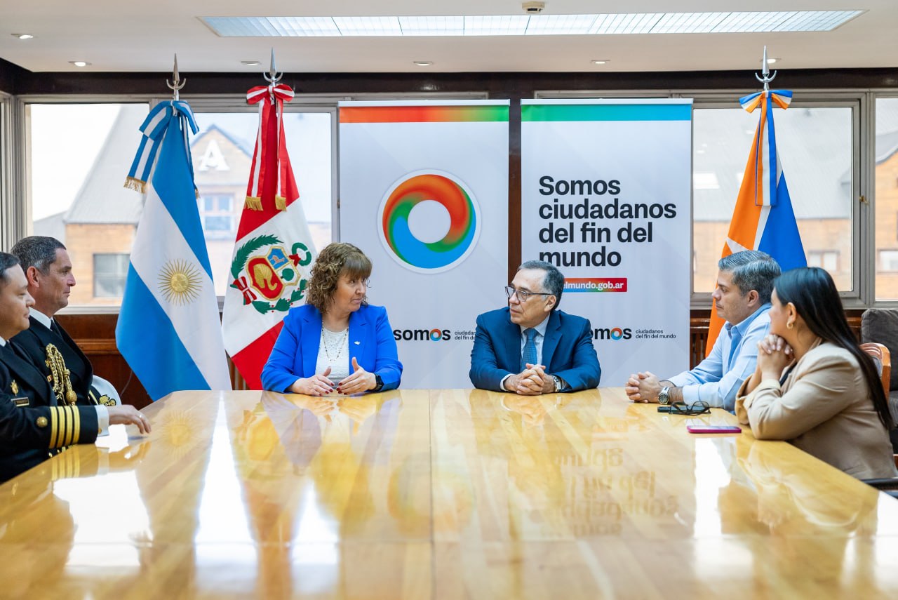 Mónica Urquiza, recibió este lunes al Embajador de Perú en Argentina, Carlos Alberto Chocano Burga y al Capitán de Navío Víctor Manuel Vivanco Moscoso, comandante del buque polar de la Armada Peruana.