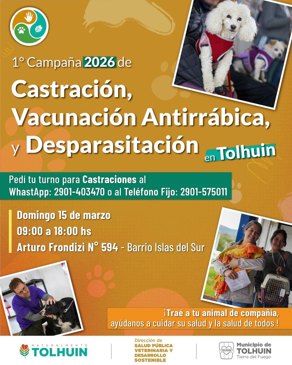 El Municipio de Tolhuin llevará adelante la primera campaña gratuita del año 2026 de castración, vacunación antirrábica y desparasitación de animales de compañía.