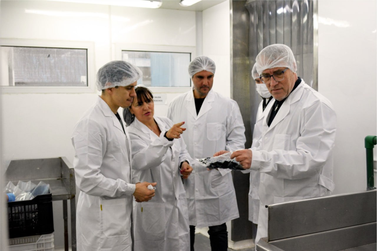 La ministra de Producción y Ambiente, Karina Fernández, junto al subsecretario de Coordinación Pesquera y Acuícola, Diego Marzioni y el actual asesor del CFI, Guillermo Abdala, recorrieron la Planta donde pudieron observar el procesamiento de mejillones y crustáceos que allí también se realiza.