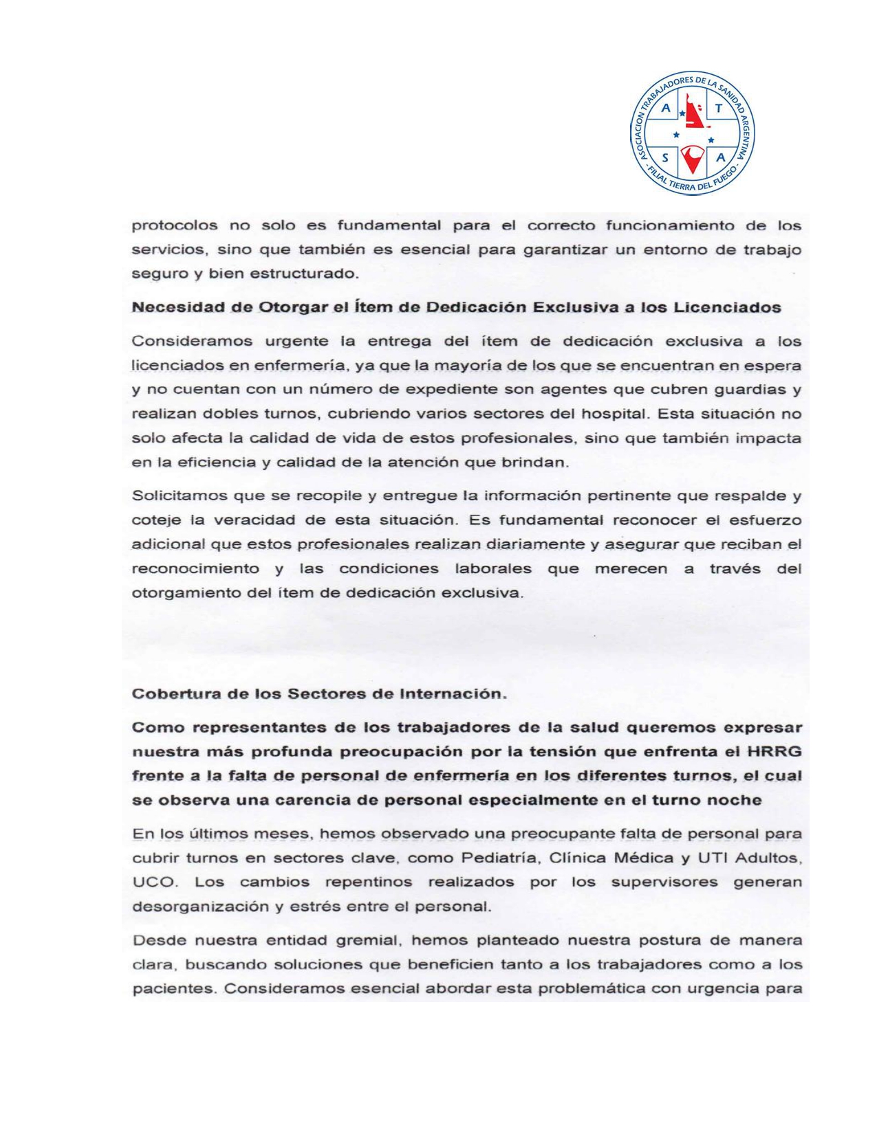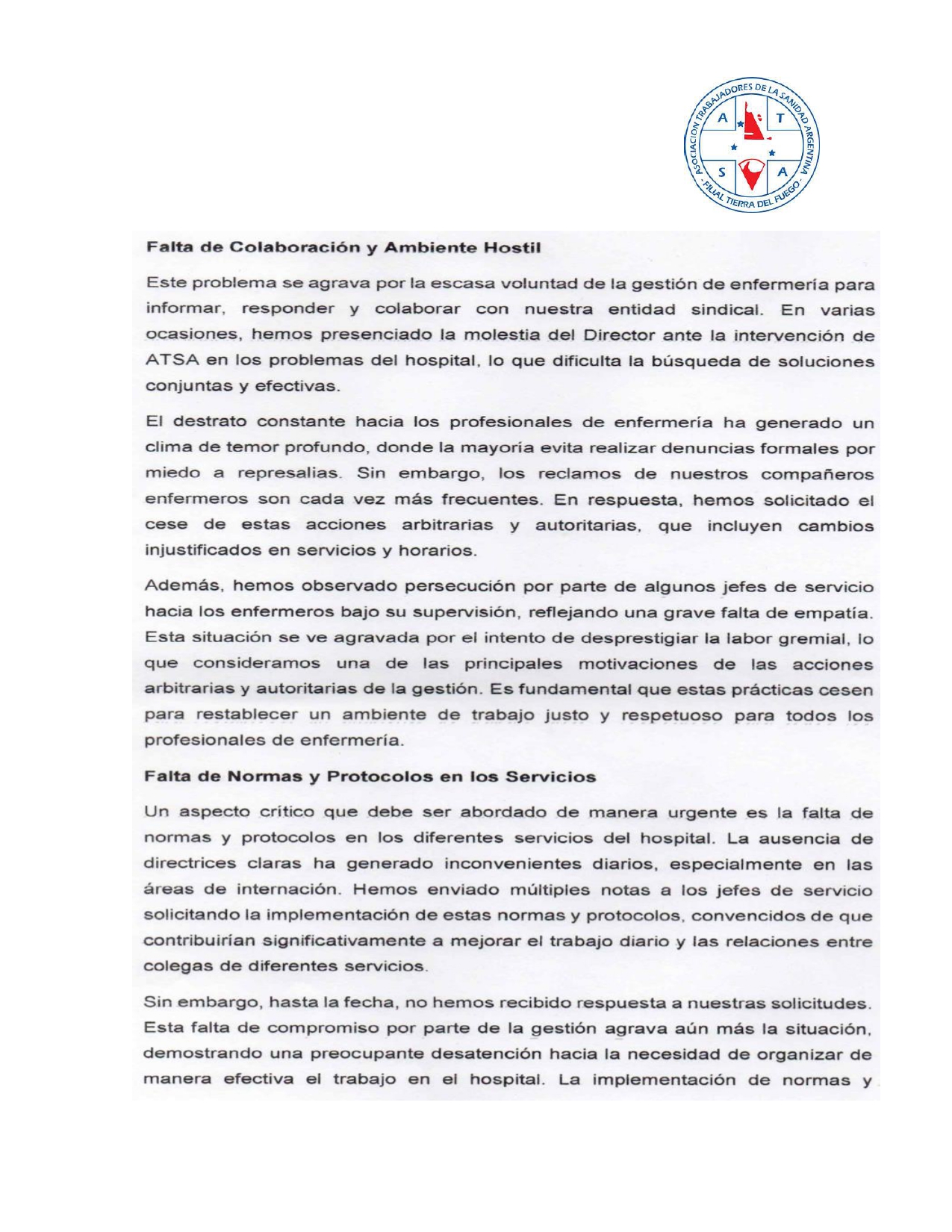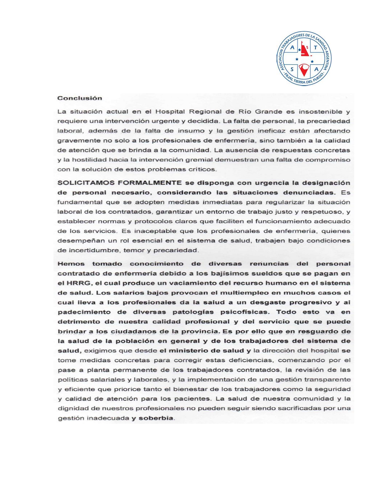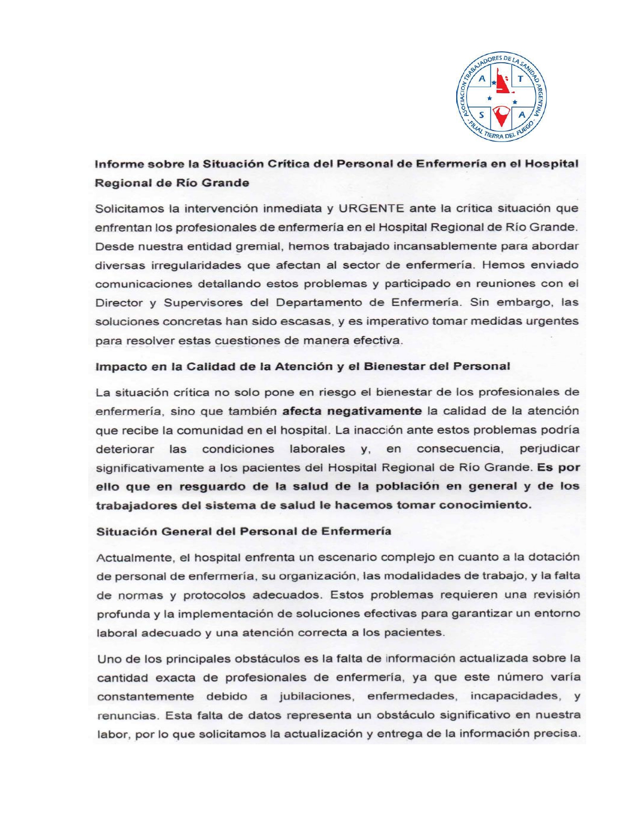 Desde el gremio ATSA, se dio a conocer un extenso documento que refleja la actual situación que se vive en el nosocomio local. Tras un relevamiento del personal de enfermería, se pudo conocer la complejidad en cuanto a la modalidad de trabajo, organización y falencias que presenta en estos momentos el Hospital Regional Río Grande.